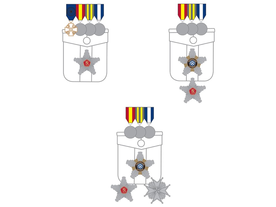 Paraatipuvussa kannetaan alkuperäiskokoisia kunniamerkkejä, pienessä juhlapuvussa pienoiskunniamerkkejä.