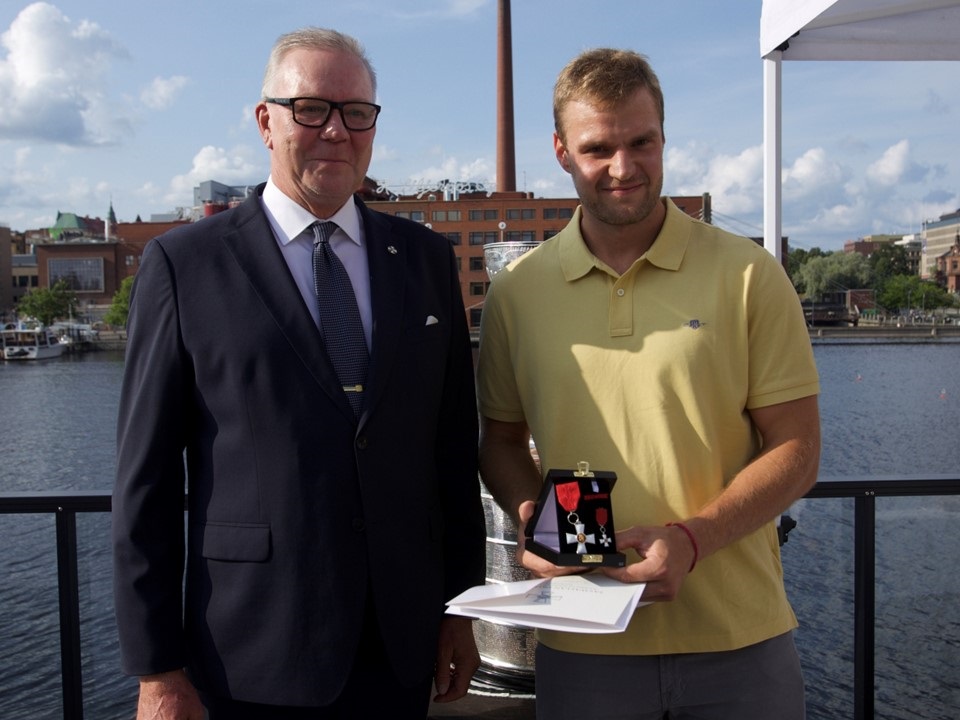 Kansleri Laitinen ja jääkiekkoilija Alexander Barkov kunniamerkkeineen Kansler Laitinen och hockeyspelaren Alexander Barkov. Kuva Bild Florida Panthers